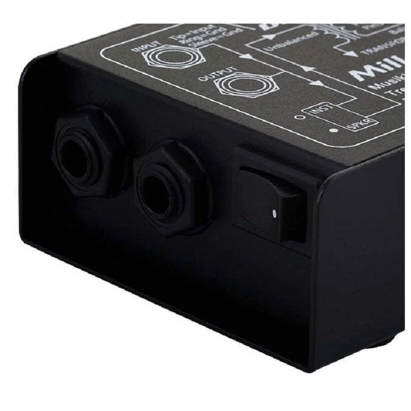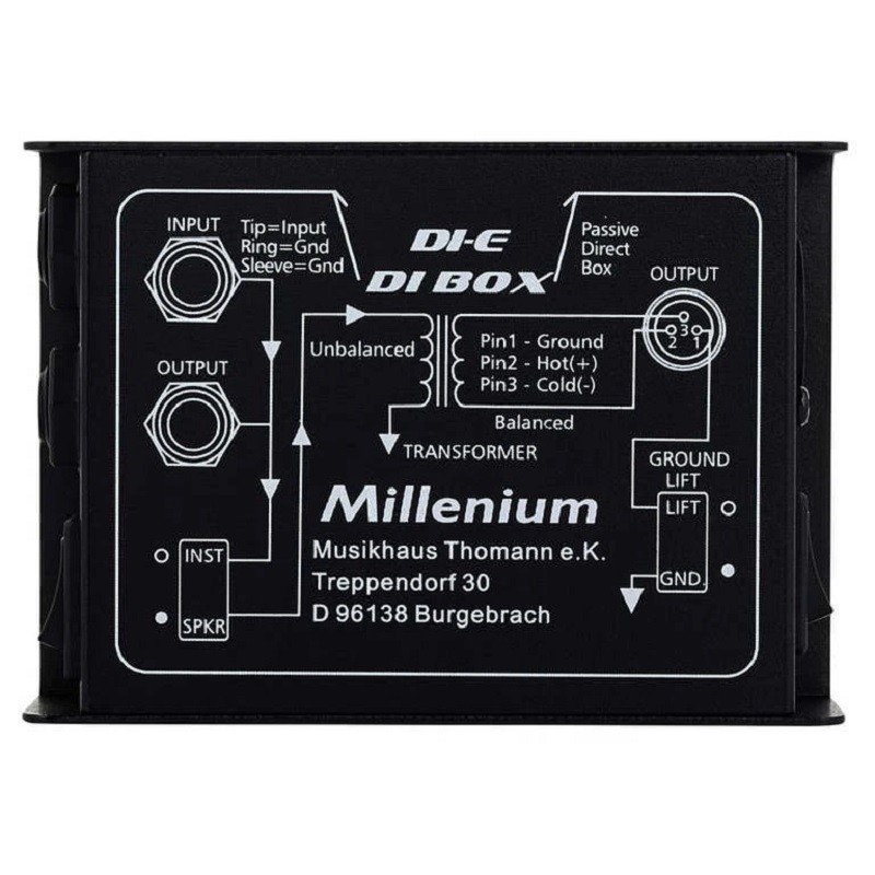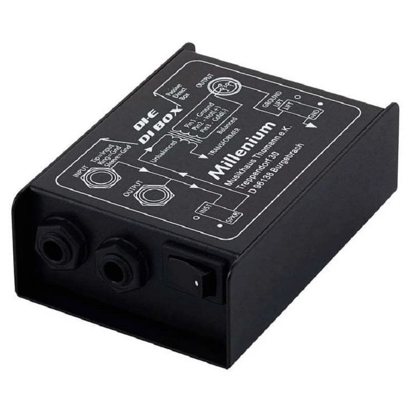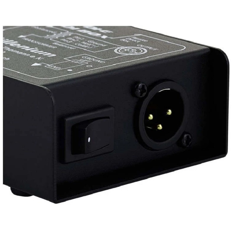 Millenium DI-E: Una caja de inyección directa (DI) de carcasa metálica esencial para músicos y técnicos de sonido. Convierte señales de instrumentos en balanceadas para un sonido limpio y profesional en cualquier escenario.