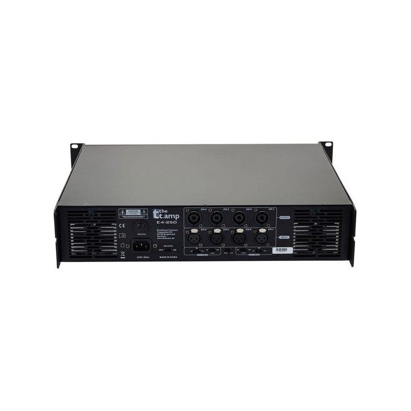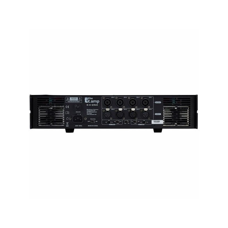 Amplificador de potencia profesional de 4 canales, cada uno con 250 W a 4 ohmios. Ideal para sistemas de sonido multizona, monitores o instalaciones fijas. Protección contra sobrecarga y sobrecalentamiento. Entradas balanceadas y salidas speakon. Construcción sólida y funcionamiento silencioso. Excelente rendimiento y fiabilidad en formato compacto y económico.