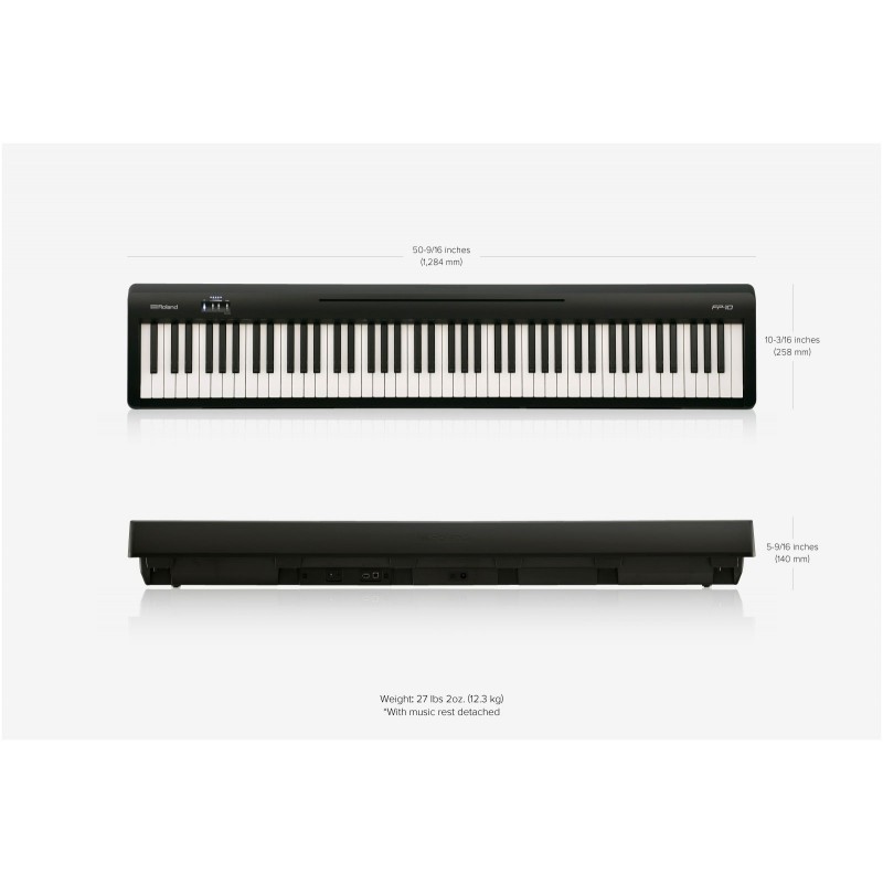 Roland FP-10 es un piano digital accesible con teclado contrapesado PHA-4 Standard que brinda sensación auténtica. Utiliza tecnología SuperNATURAL para un sonido dinámico y expresivo. Incluye conectividad Bluetooth MIDI y altavoces integrados. Es ideal para estudiantes y músicos que buscan un instrumento compacto, portátil y confiable para práctica diaria y aprendizaje progresivo del piano.