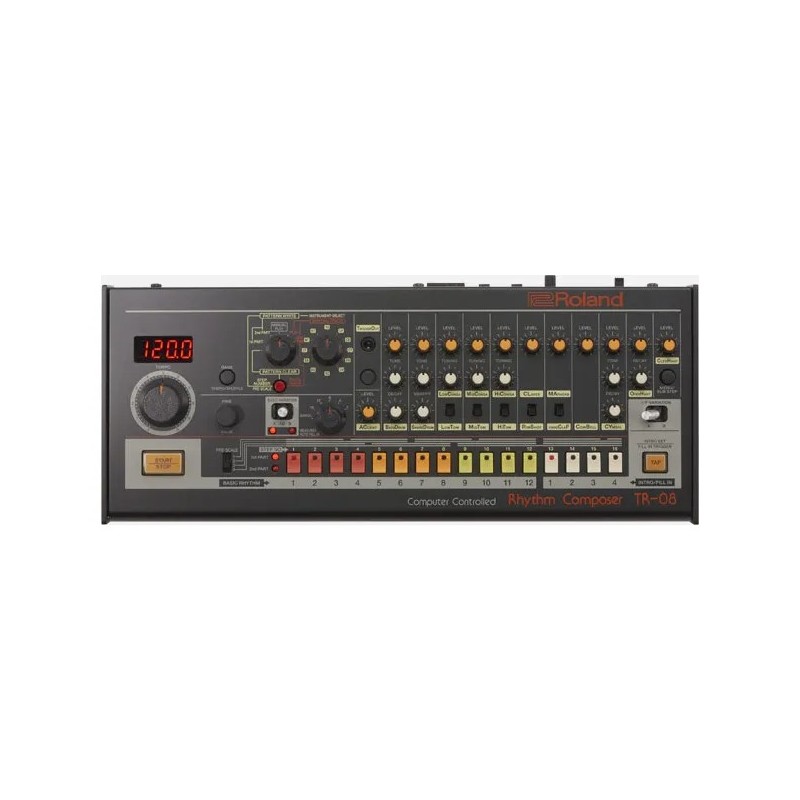 La Roland TR-08 es una recreación meticulosa de la icónica caja de ritmos TR-808 de Roland. Con su diseño compacto y portátil, ofrece la legendaria gama de sonidos de batería que hicieron famosa a la TR-808. Desde los característicos bombo y caja hasta los platillos y efectos, esta máquina de ritmo captura la esencia del sonido electrónico de los años 80.