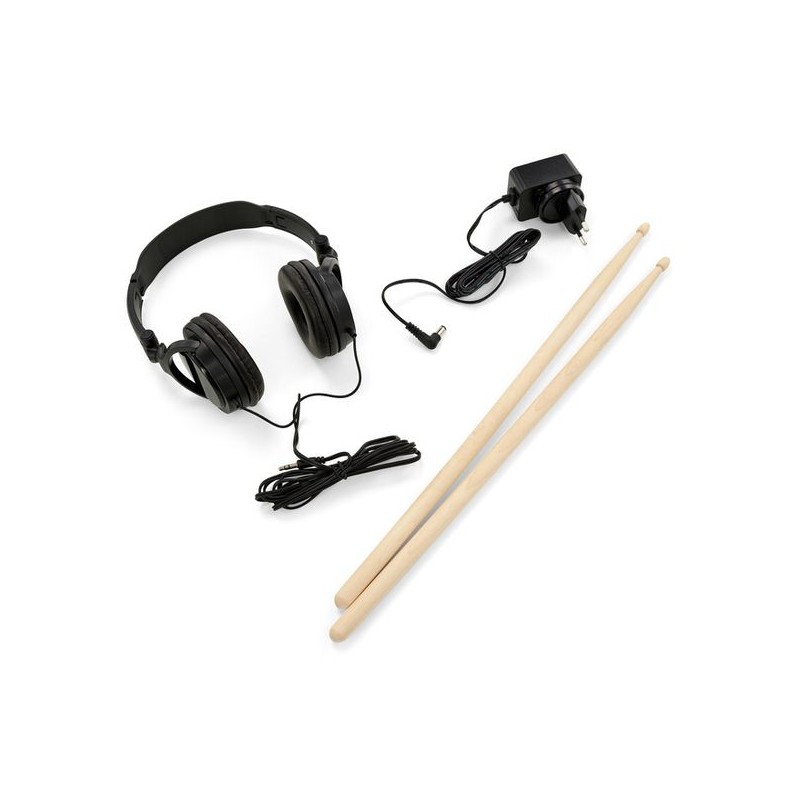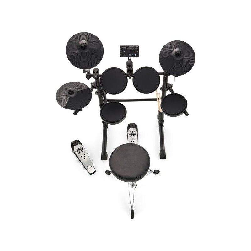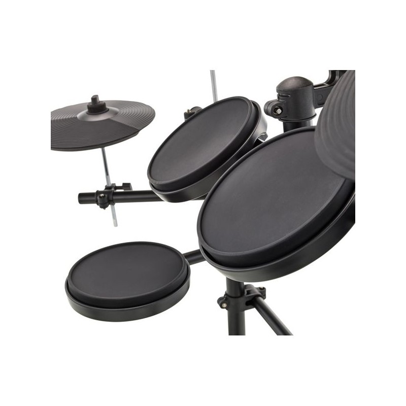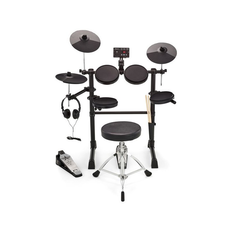 Presentamos el Millenium HD-120 E-Drum Set: perfecto para jóvenes bateristas. Incluye cinco pads de batería, dos pads de platillos, un pad de hi-hat con controlador y un controlador de bombo, todo en un soporte resistente. Además, cuenta con varios kits de batería en el módulo de sonido, y viene con asiento, auriculares y baquetas para empezar a tocar de inmediato.